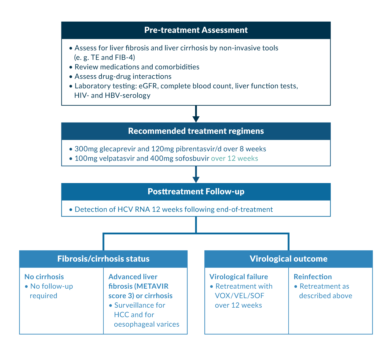 Prior to initiating HCV therapy, the presence of viraemia should be verified by detecting HCV RNA or if not available or not affordable HCV core antigen in serum or plasma. Identifying HCV genotype is not mandatory before starting pan-genotypic HCV drug regimens but should be done prior to initiating genotype-specific DAA therapy. In addition, HCV genotype determination is useful, if available, in order to identify HCV subtypes, which are resistant to NS5A inhibitors (i. e. HCV genotype 3c), and to identify patients, who may benefit from an adapted HCV treatment. Figure 1 provides an overview of the treatment process in the case of HCV therapy, from pre-treatment assessment to a simplified therapy with genotype/subtype-free combinations and the post-treatment follow-up.