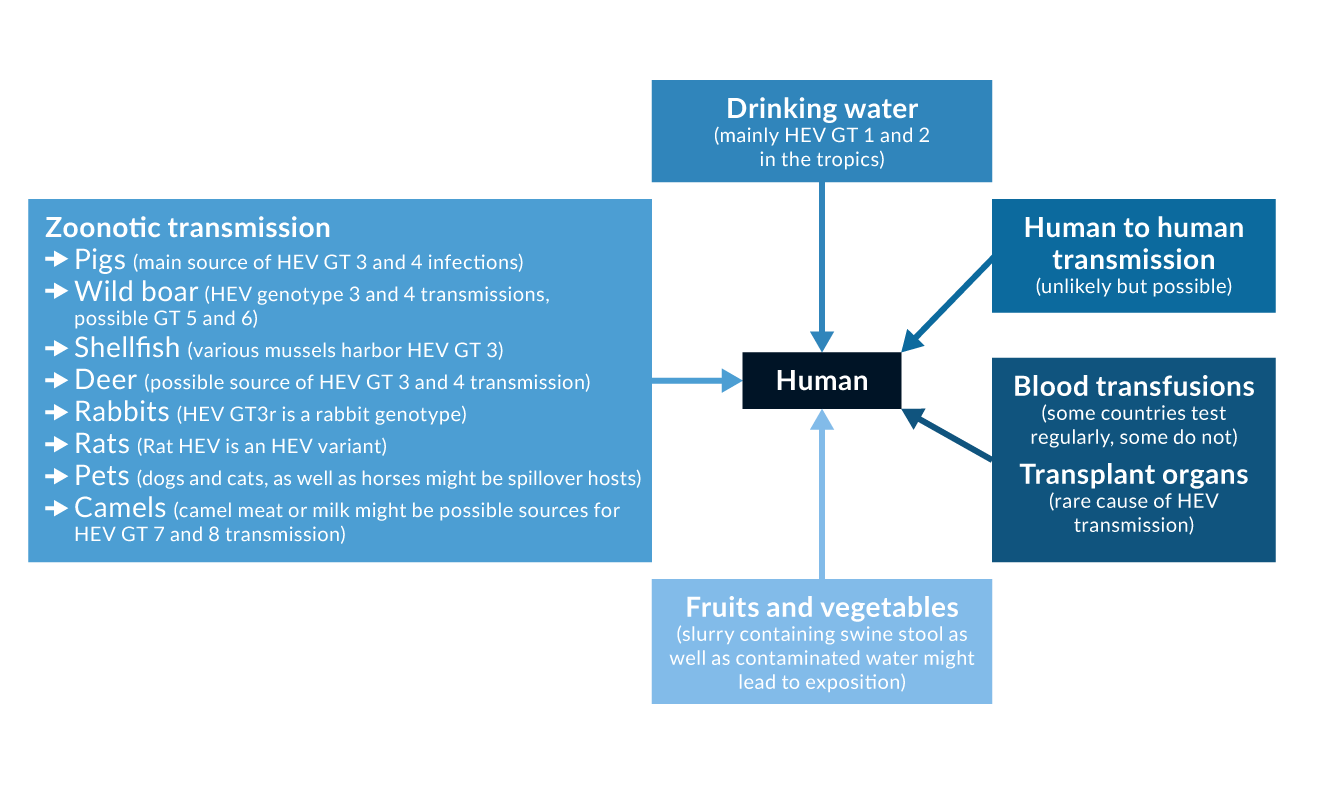 In summary, there are many different sources of infection for HEV transmission (Figure 2).