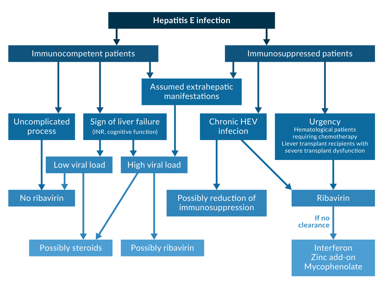 First results indicate that ribavirin treatment of chronic hepatitis E (3 to 5 months duration) is effective to achieve sustained virological response in immunocompromised persons. In contrast, in immunocompetent individuals with acute HEV infection this treatment is only required in few cases to avoid liver failure.