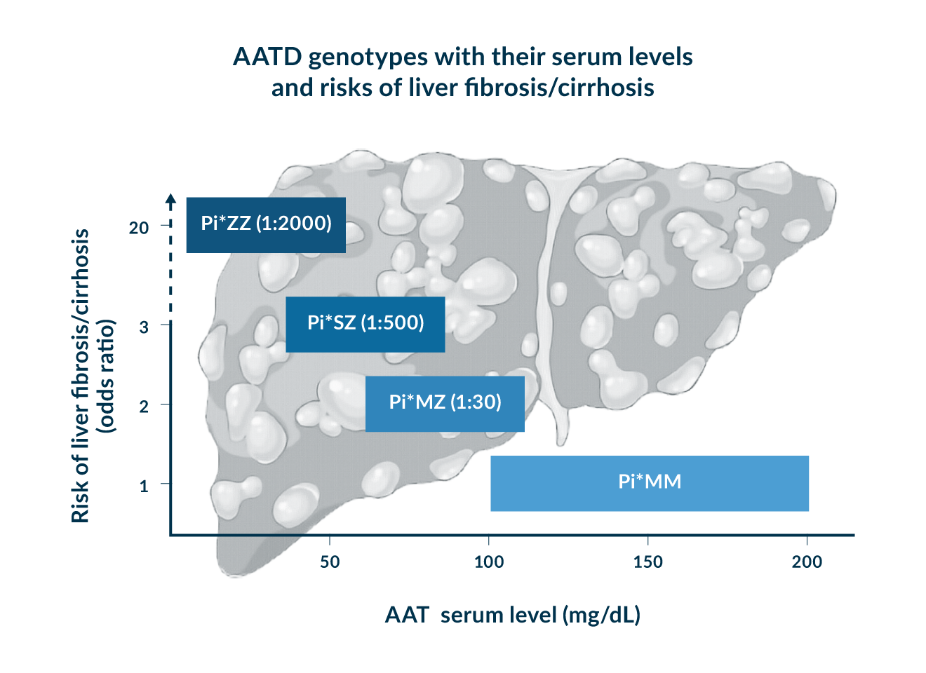 Figure 1. Characteristic AATD genotypes, their prevalence, AAT serum levels and corresponding risk of adult liver fibrosis/cirrhosis.