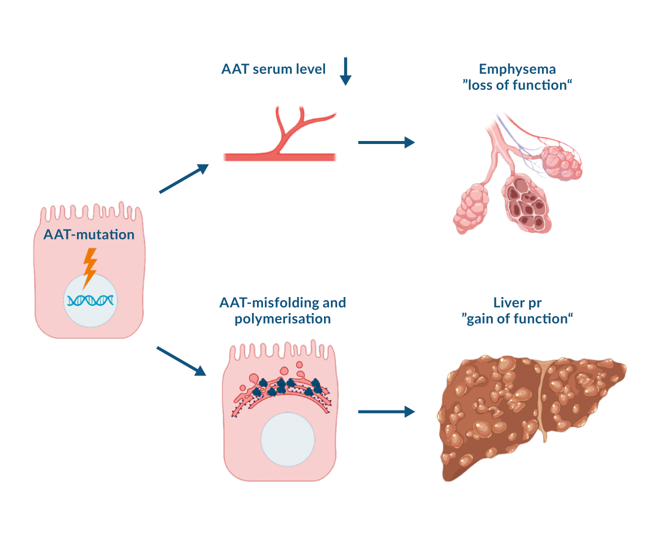 - AATD predisposes to liver diseases caused by a proteotoxic “gain-of-function” and lung emphysema/chronic obstructive pulmonary disease caused by a “loss-of-function”.