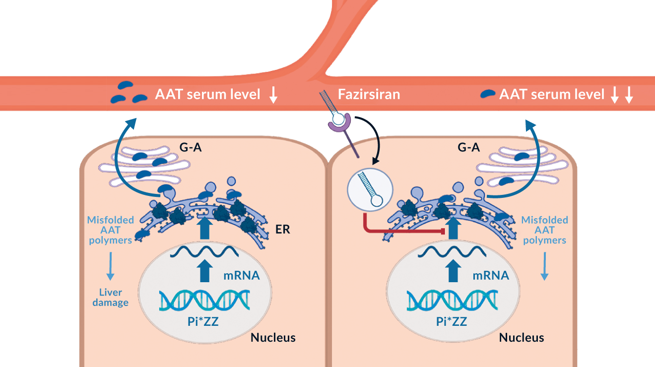 Figure 3. Biological effect of alpha-1 antitrypsin (AAT) mutation and the mode of action of fazirsiran, a small interfering RNA blocking AAT production