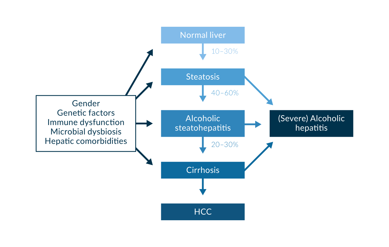 There is significant individual variability in the relationship between extent of alcohol consumption and onset and severity of ALD. Predisposition to ALD is mediated by environmental, genetic and epigenetic factors; for the development of more severe forms such as alcoholic hepatitis-associated liver failure, conclusive causative scientific evidence is still lacking (Bataller 2022).