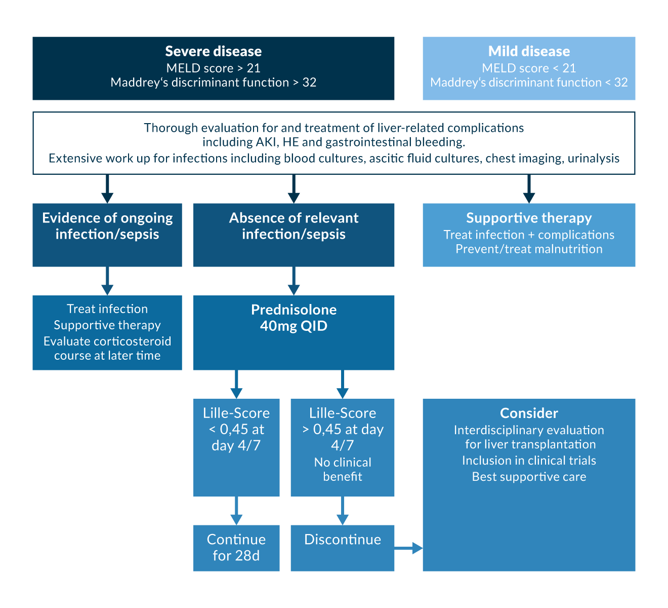 As corticosteroids increase the risk of infection which is one of the major complications contributing to mortality in the presence of alcoholic liver failure, the Lille Score has been useful in predicting lack of response to corticosteroids and is calculated on day 7 after initiation of treatment (Louvet 2007). Calculations can also be performed on day 4 (Garcia-Saenz-de-Sicilia 2017).